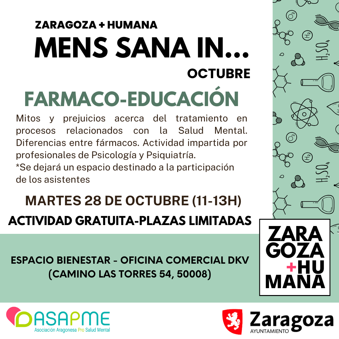 Mens Sana: FARMACO-EDUCACIÓN. Mitos y prejuicios acerca del tratamiento en procesos relacionados con la Salud Mental. Diferencias entre fármacos. Actividad impartida por profesionales de Psicología y Psiquiatría.