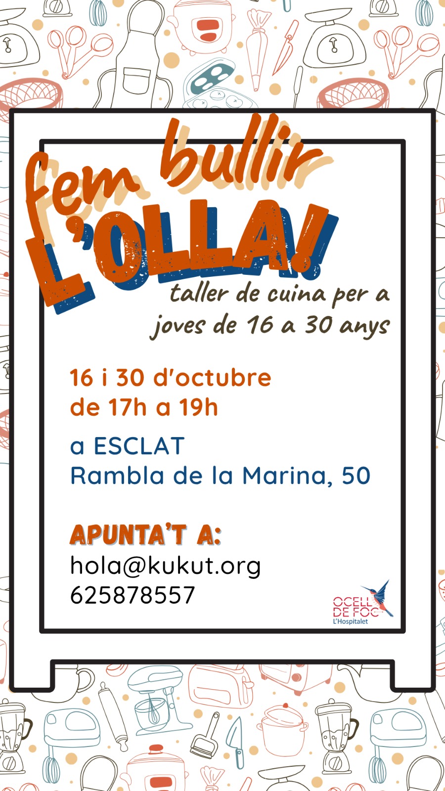 Cada dos dimecres, entre les 5 i les 7 Ocell de Foc fa un taller de cuina al centre educatiu Esclat (Rambla de la Marina, 50). És per joves entre 16-30 vinculats a Hospitalet. Es necessita inscripció prèvia, però el grup romandrà obert durant tot el trimestre. Ocell de Foc és dedica a l'atenció de joves, especialment aquells amb problemàtica de salut mental, i el seu acompanyament cap a l’autonomia personal i la construcció d’una vida independent, proporcionant-los les eines i els recursos per poder aconseguir-ho i per assolir la seva inserció laboral en l’empresa ordinària o la recuperació del seu itinerari formatiu.
