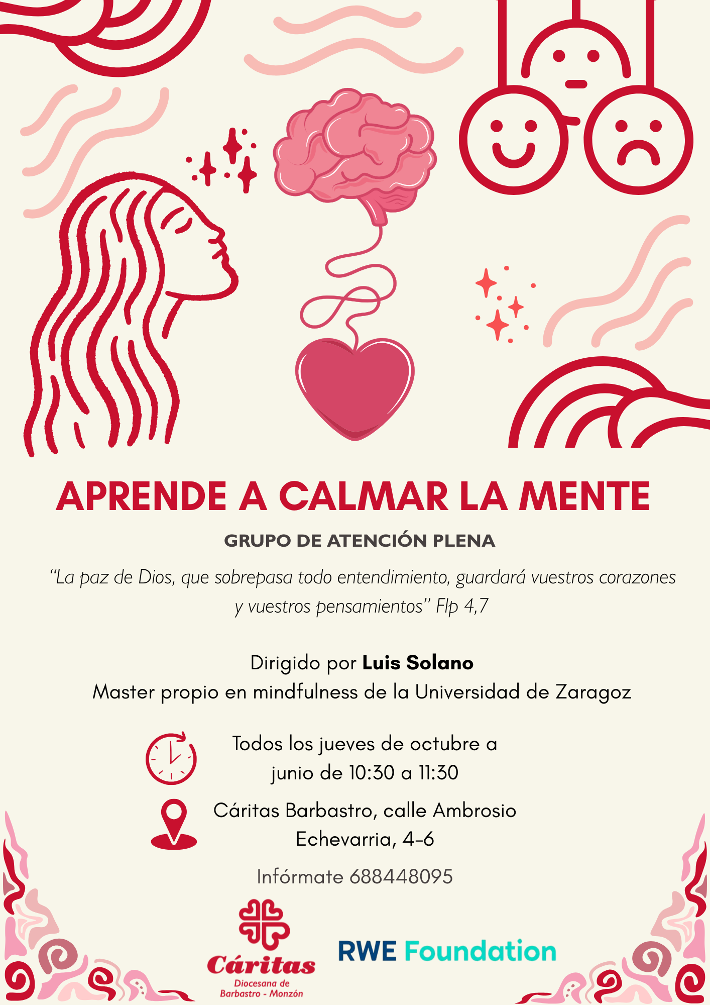 Desde Cáritas Barbastro-Monzón abrimos un espacio semanal de silencio, respiración y atención plena, guiado por Luis Solano (máster propio en la Universidad de Zaragoza). Un tiempo sencillo en el que, juntos, aprendemos a cuidar nuestra interioridad, a vivir con más calma y a descubrir la presencia de Dios en lo cotidiano.