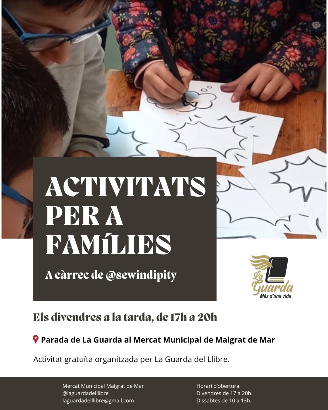 Els divendres a la tarda, de 17 a 20h La Guarda del llibre obre la parada que té en el Mercat Municipal de Malgrat de Mar i una voluntària de la nostra associació fa manualitats en el racó de llibres infantils, sempre amb llibres reciclats i relacionat amb l'efemèride del dia o de la setmana